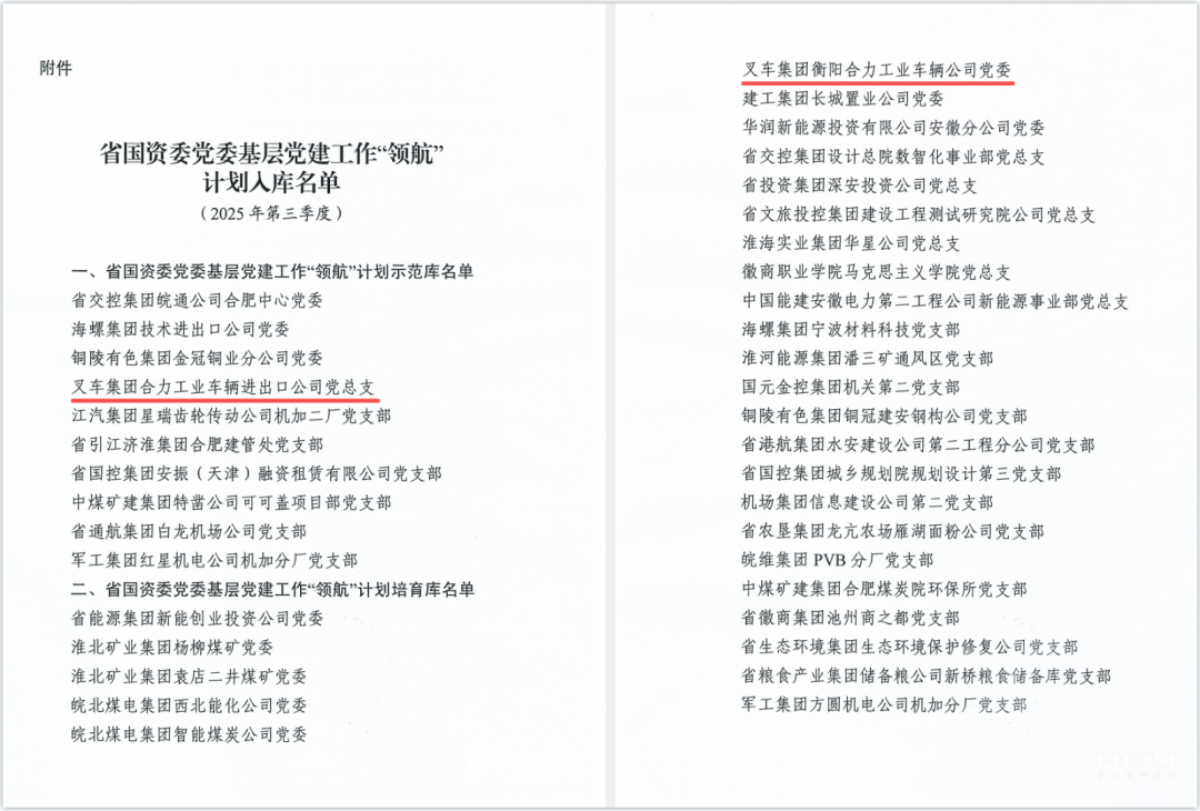 安徽叉車(chē)集團(tuán)黨委兩個(gè)黨組織分別入選省國(guó)資委黨委基層黨建工作“領(lǐng)航”計(jì)劃示范庫(kù)、培育庫(kù)